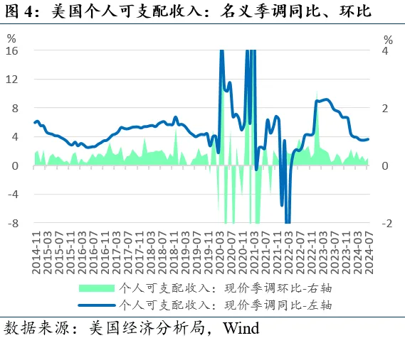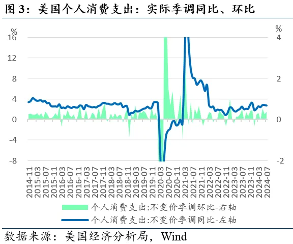 个人消费支出增速稳健但收入增速降低。美国经济分析局8月30日公布的数据显示,7月美国个人消费支出(PCE)现价季调折年19.581万亿美元,季调环比+0.5%(预期+0.5%,前值+0.3%),季调同比+5.3%(前值+5.4%)。按不变价格计算,季调环比+0.4%(前值+0.3%),季调同比+2.7%(前值+2.8%)。个人可支配收入现价季调环比+0.2(前值+0.4%),季调同比+3.6%(前值+3.5%)。按不变价格计算,季调环比+0.1%(前值+0.1%),季调同比+1.1%(前值+1.0%)。