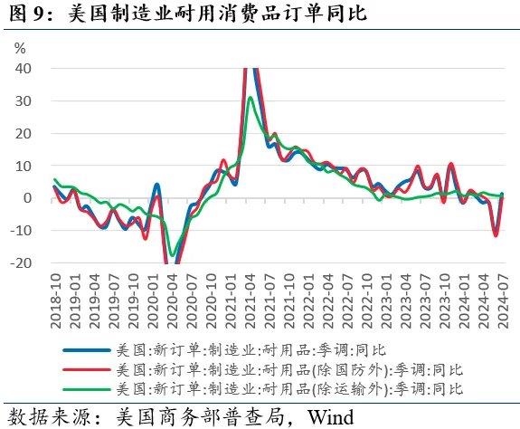 7月耐用消费品订单环比回升。美国商务部普查局8月26日发布的数据显示,7月美国制造业耐用品订单季调环比+9.9%(前值-6.9%),季调同比+1.3%(前值-10.6%);除国防外季调耐用品订单季调环比+10.4%(前值-7.5%),季调同比+0.4%(前值-11.7%);除运输外耐用品订单季调环比-0.2%(前值+0.1%),季调同比+0.7%(前值+0.7%)。