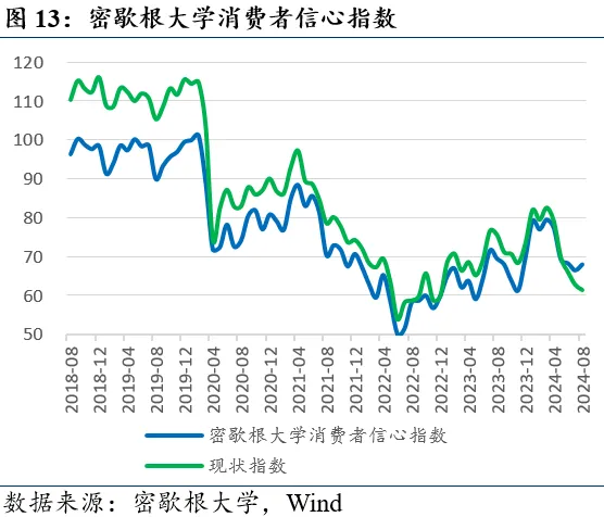 密歇根大学消费信心终值上调,通胀预期通胀下调。8月密歇根大学消费者信心指数为67.9(初值67.8,前值66.4),现状指数61.3(初值60.9,前值62.7),预期指数72.1(初值72.1,前值68.8),1年期通胀预期+2.8%(初值+2.9,前值+2.9%)。