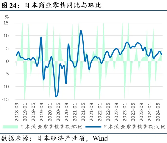 商业零售销售环比回升。日本经济产业省8月30日发布的数据显示,7月日本商业零售额14.31万亿日元(前值13.68万亿),同比+2.6%(前值+3.8%),环比+4.5%(前值+1.5%)。