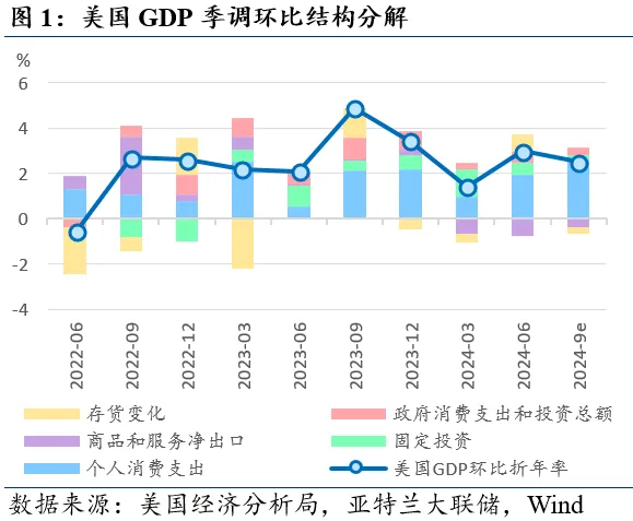 美国二季度GDP修正值小幅上调。美国经济分析局8月29日公布的数据显示,二季度美国GDP季调环比折年修正值+3.0%(初值+2.8%,前值+1.3%)。其中,个人消费贡献+2.0pp(初值1.6pp,前值+1.0pp),固定资产投资贡献+0.5pp(初值0.6pp,前值+1.2pp),净出口贡献-0.8pp(初值-0.7pp,前值-0.7pp),政府部门贡献+0.5pp(初值+0.5pp,前值+0.3pp),存货变化贡献+0.8pp(初值+0.8pp,前值-0.4pp)。亚特兰大联储8月30日更新的GDPNow预测数据显示,2024年三季度美国GDP预计季调年化环比增长2.5%,较上周预测上升0.5个百分点,主因个人消费预期强劲。